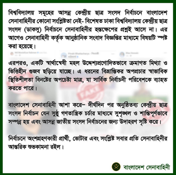 আরও বলা হয়, বাংলাদেশ সেনাবাহিনী আশা করে— দীর্ঘদিন পর অনুষ্ঠিতব্য কেন্দ্রীয় ছাত্র সংসদ নির্বাচন যেন সুষ্ঠু গণতান্ত্রিক চর্চার মাধ্যমে সুশৃঙ্খল ও শান্তিপূর্ণভাবে সম্পন্ন হয় এবং আসন্ন জাতীয় সংসদ নির্বাচনের জন্য উদাহরণ সৃষ্টি করে। নির্বাচনে অংশগ্রহণকারী প্রার্থী, ভোটার এবং সংশ্লিষ্ট সবার প্রতি সেনাবাহিনীর আন্তরিক শুভকামনা রইল।