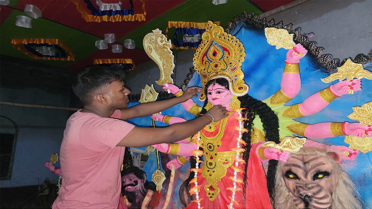 আক্কেলপুর (জয়পুরহাট) প্রতিনিধি : সনাতন সম্প্রদায়ের প্রধান ধর্মীয় উৎসব শারদীয় দুর্গাপূজা শুরুর আর মাত্র এক দিন বাকি। শহর থেকে গ্রাম, পাড়া-মহল্লা সর্বত্র লেগেছে উৎসবের আমেজ। পূজার আনন্দঘন পরিবেশকে রাঙাতে দিন-রাত কঠোর পরিশ্রমে ব্যস্ত মৃৎশিল্পীরা। শেষ আঁচড়ের ছোঁয়ায় দেবী দুর্গা প্রতিমায় ফুটে উঠছে জীবন্ত রূপ।