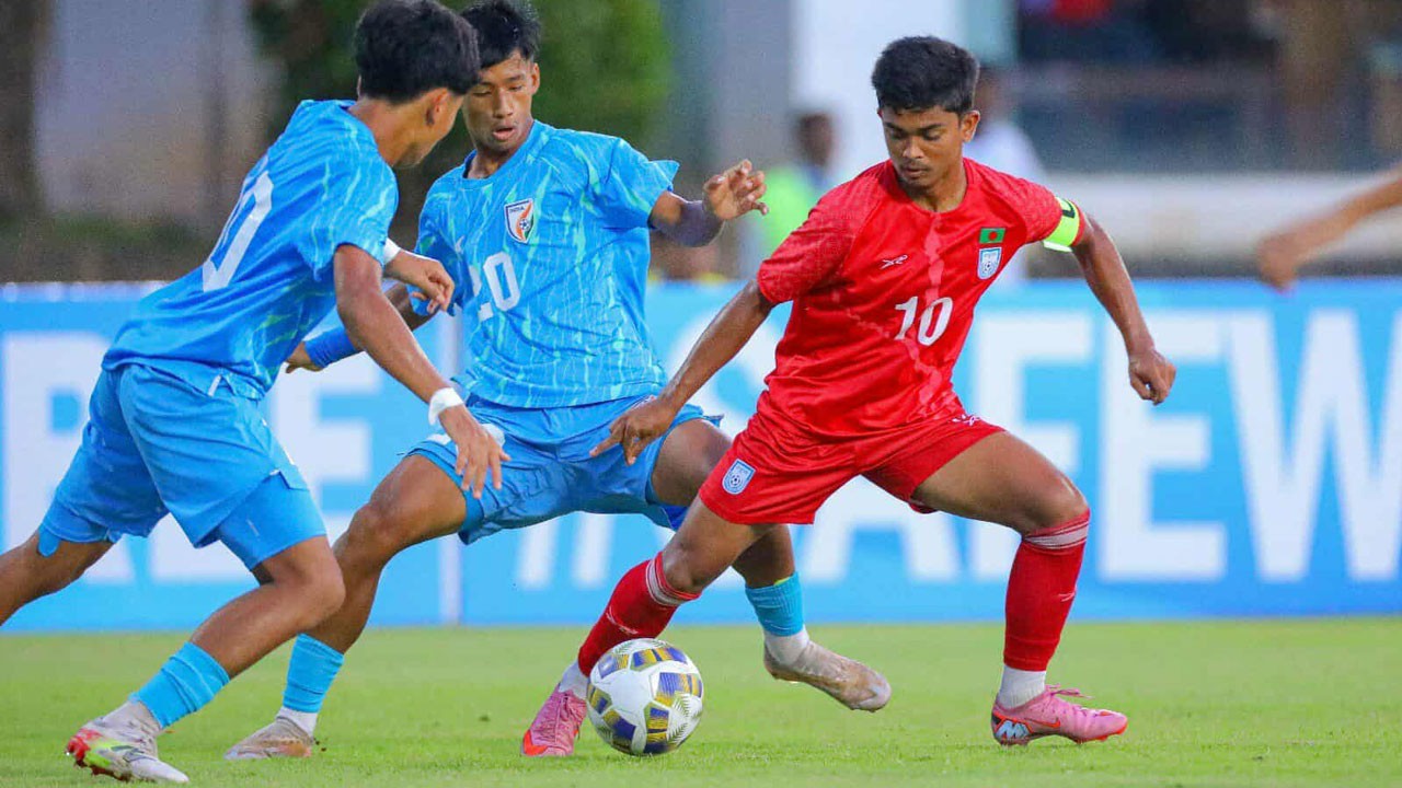 শেষ মুহূর্তে গোল হজম করে পরাজয়—এটা যেন বাংলাদেশের ফুটবলের এক নিয়মিত চিত্র ছিল। সেই চিত্রটাই আজ বদলে ফেলেছিল অনূর্ধ্ব-১৭ ফুটবলাররা। সাফ চ্যাম্পিয়নশিপের ফাইনালে একদম শেষ মুহূর্তে ভারতকে গোল দিয়ে সমতায় ফেরে। কিন্তু ২-২ গোলে ড্র করেও বিজয়ের হাসি হাসা হয়নি বাংলাদেশের।