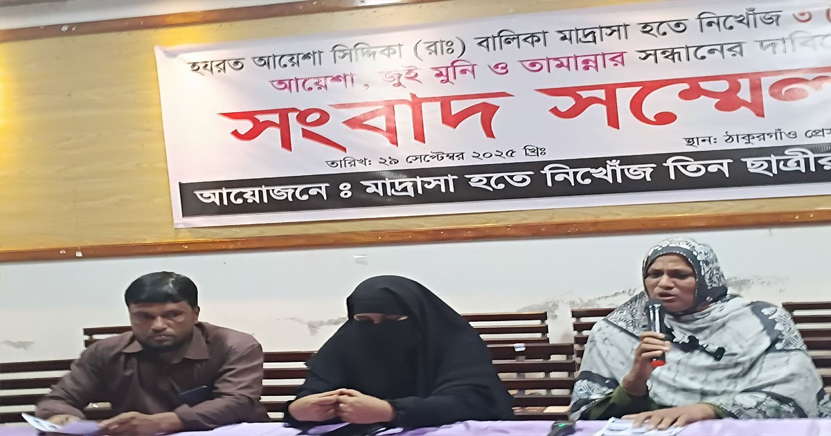 প্রসঙ্গত, গত ৮ সেপ্টেম্বর গভীর রাতে ঠাকুরগাঁও শহরের দক্ষিণ সালন্দর এলাকার হযরত আয়েশা সিদ্দিকা (রা.) বালিকা হাফিজিয়া মাদ্রাসা থেকে নিখোঁজ হন তামান্না আক্তার (১৬), জুঁই খাতুন (১৫) ও আয়েশা খাতুন (১৩)। তারা দীর্ঘদিন ধরে মাদ্রাসাটির হাফিজি ও কিতাবি বিভাগে পড়াশোনা করছিলেন।