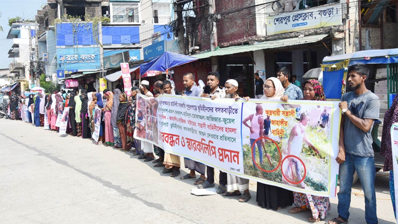 বগুড়ার শেরপুরে সম্পত্তি জবর দখল ও মিথ্যা মামলার অভিযোগে ভূমিহীনদের মানববন্ধন