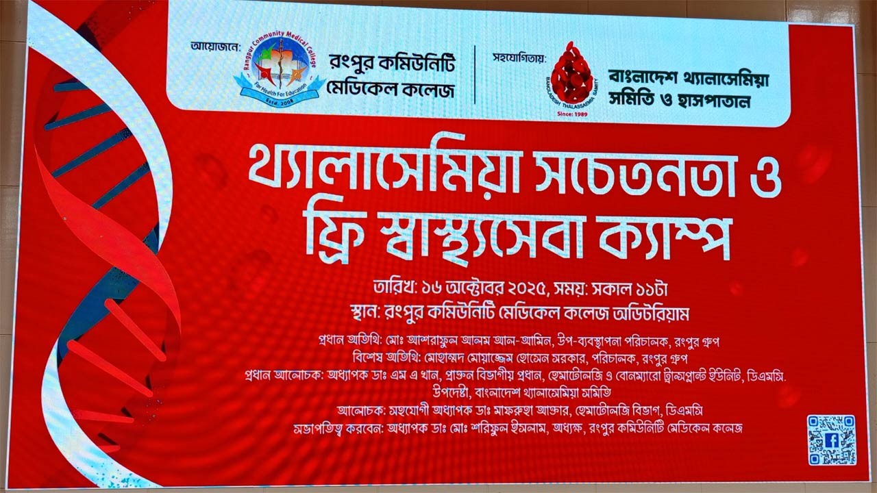 বাংলাদেশ থ্যালাসেমিয়া সমিতি ও হাসপাতালের সহযোগিতায় থ্যালাসেমিয়া সচেতনতা ও ফ্রি স্বাস্থ্যসেবা ক্যাম্পের আয়োজন করে রংপুর কমিউনিটি মেডিকেল কলেজ। পরে দিনব্যাপী ৫০ জন থ্যালাসেমিয়া রোগীকে বিনামূল্যে চিকিৎসা সেবা দেওয়া হয়।