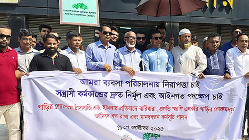 বিক্রয়কেন্দ্রে হামলা ও চাঁদাবাজির প্রতিবাদে রাজধানীর সব গাড়ির দোকান অর্ধদিবস বন্ধ রেখে মানববন্ধন কর্মসূচি পালন করেছেন গাড়ি ব্যবসায়ীরা। হামলার ঘটনায় জড়িতদের গ্রেপ্তার ও চাঁদাবাজি বন্ধ না হলে নভেম্বর মাস থেকে গাড়ি ছাড় করা, নিবন্ধন করা ও রাজস্ব দেওয়া বন্ধের হুঁশিয়ারি দিয়েছেন তারা।