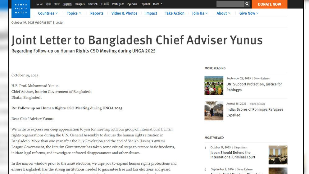 ২০২৬ সালের নির্বাচনের আগে যে অল্প সময় রয়েছে, সেই সময়ে আমরা আপনার প্রতি মানবাধিকার রক্ষার পরিসর বাড়ানোর আহ্বান জানাচ্ছি। একই সঙ্গে বাংলাদেশে অবাধ ও সুষ্ঠু নির্বাচনের নিশ্চয়তা বিধান এবং ভবিষ্যতে পরিস্থিতির অধঃপতন ঠেকানোর জন্য প্রয়োজনীয় শক্তিশালী প্রতিষ্ঠানসমূহ নিশ্চিত করতে আহ্বান জানাচ্ছি। আমরা গভীরভাবে উদ্বিগ্ন যে নিরাপত্তা খাত এখনো সংস্কার হয়নি এবং নিরাপত্তা বাহিনীর সদস্যরা জবাবদিহি ও সংস্কারপ্রচেষ্টায় সম্পূর্ণভাবে সহযোগিতা করছেন না।অন্তর্বর্তী সরকারকে অবশ্যই বিগত সরকারের অধীনে সংঘটিত গুরুতর নিপীড়নের জন্য বিচার নিশ্চিত করতে আরও পদক্ষেপ নিতে হবে, একইসঙ্গে অবিলম্বে চলমান নির্বিচার গ্রেফতার ও আটক বন্ধ করতে হবে। এর মধ্যে আওয়ামী লীগের সদস্যদের বিরুদ্ধে দায়ের করা সেসব মামলাও রয়েছে, যেগুলো রাজনৈতিক উদ্দেশ্যপ্রণোদিত বলে মনে হয় এবং গ্রহণযোগ্য তথ্য–প্রমাণের ঘাটতি রয়েছে।