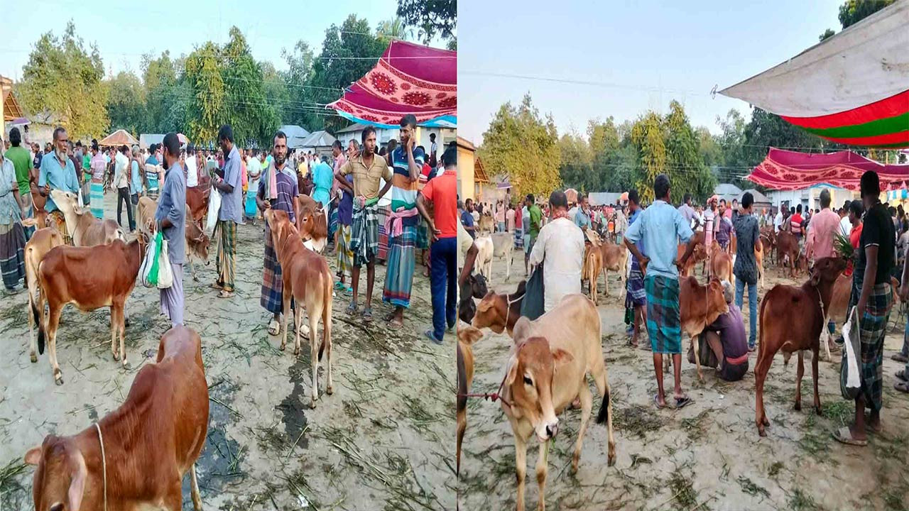 আজ বৃহস্পতিবার (২৩ অক্টোবর) সরেজমিনে ওই হাটে গিয়ে প্রচুর গরু-ছাগলের আমদানি লক্ষ্য করা গেছে। সেই সাথে স্থানান্তর করা গরুর হাটটি বসানো হয়েছে একটি ধান-চাল শুকানো চাতালে। সেই চাতালে গরুর হাটে টানানো হয়েছে কাপড়ের তাবু। খোঁজ নিয়ে জানা গেছে, হাটে আসা গরুগুলোকে প্রচণ্ড গরম ও রোদের হাত থেকে রক্ষা করার জন্য হাট কমিটি এই ব্যবস্থা করেছে।