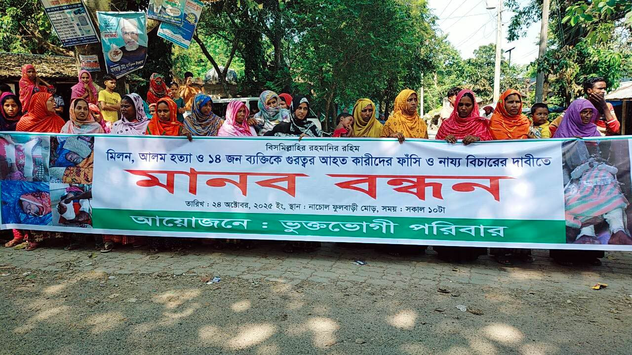 আজ শুক্রবার (২৪ অক্টোবর) বেলা পৌনে ১১টায় এ ঘটনায় জড়িতদের দৃষ্টান্তমূলক বিচারের দাবিতে ভুক্তভোগী পরিবারের ব্যানারে ফুলবাড়ি মোড়ে মানববন্ধন ও বিক্ষোভ কর্মসূচি অনুষ্ঠিত হয়। মানববন্ধনে বক্তব্য দেন- নিহত মিলনের স্ত্রী সুমেরা খাতুন, আলমের স্ত্রী রেখা খাতুন, আলমের ছেলে সাদেক আলী, ইউপি সদস্য মো. শাহজাহান, উপজেলা বিএনপি নেতা আবু তাহের খোকন, মনিরুল ইসলাম প্রমুখ।