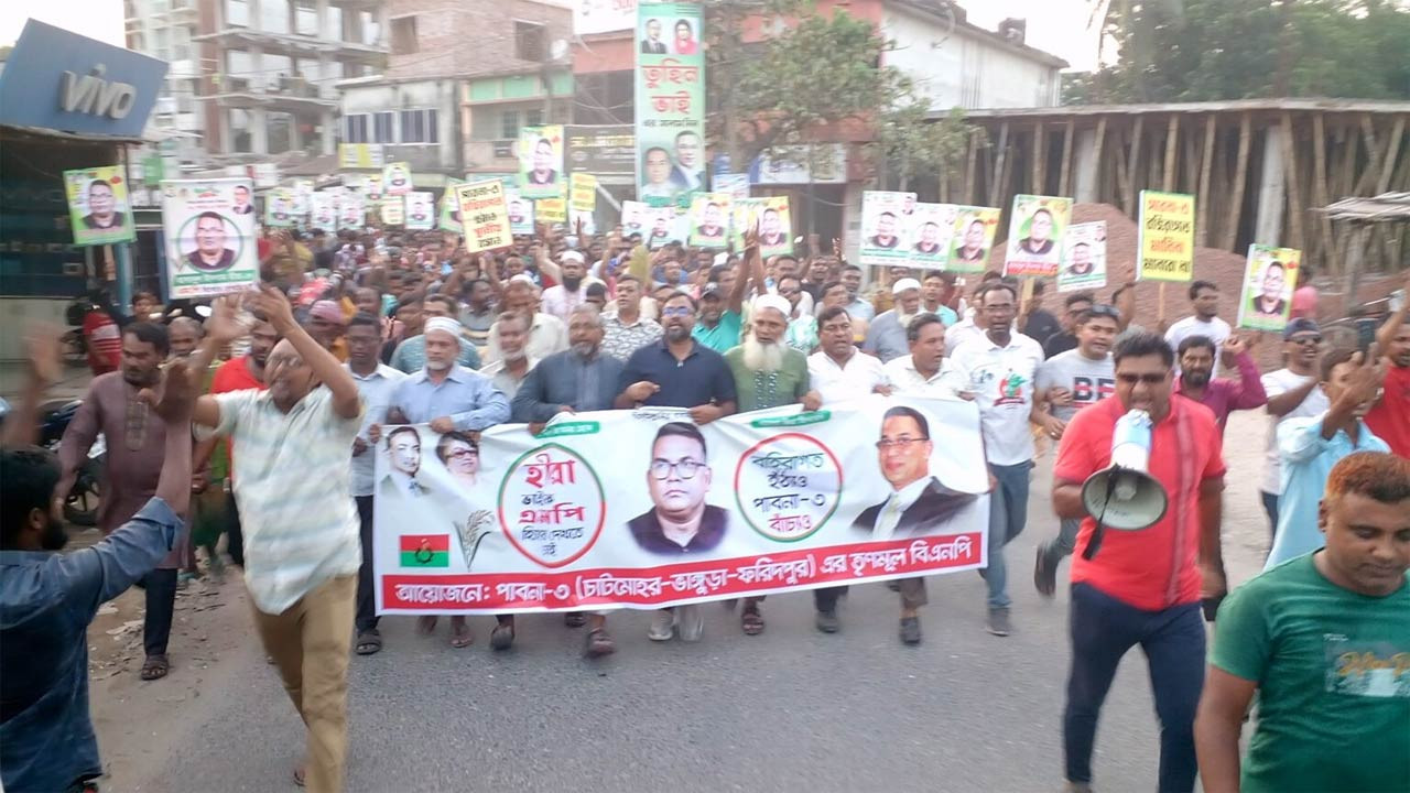 চাটমোহর (পাবনা) প্রতিনিধি : আসন্ন জাতীয় সংসদ নির্বাচনকে সামনে রেখে পাবনা-৩ আসনে বিএনপি’র দলীয় মনোনয়নে চাটমোহর থেকে প্রার্থীর দাবিতে বিক্ষোভ ও পথসভা অনুষ্ঠিত হয়েছে। আজ সোমবার (২৭ অক্টোবর) বিকেল ৩টায় বিএনপি’র দলীয় মনোনয়ন প্রত্যাশী উপজেলা বিএনপি’র সাবেক সদস্য সচিব হাসাদুল ইসলাম হীরা’র সমর্থনে বিক্ষোভ মিছিলটি চাটমোহর বাসস্ট্যান্ড থেকে শুরু হয়ে উপজেলার প্রধান প্রধান সড়ক প্রদক্ষিণ করে জারদিস মোড়ে গিয়ে শেষ হয়। সেখানে অনুষ্ঠিত হয় সংক্ষিপ্ত পথসভা।