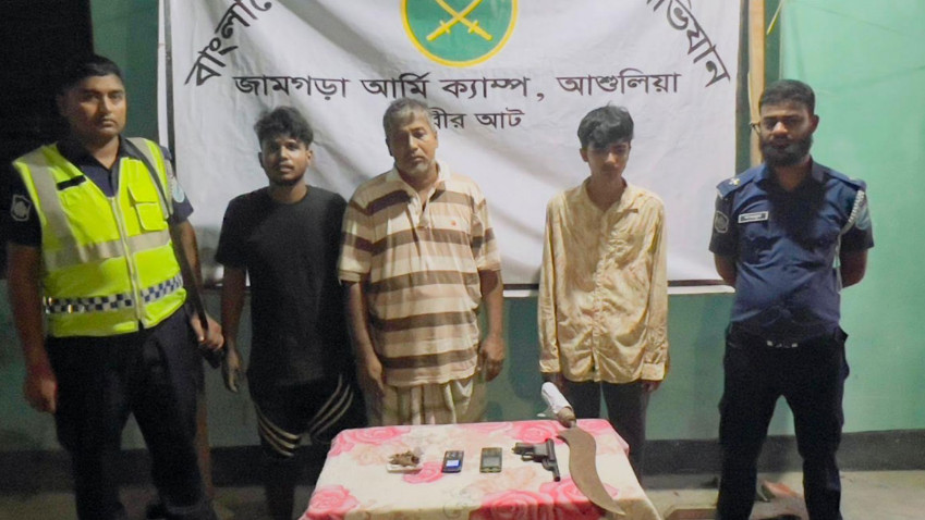 আরও পড়ুনএ ঘটনায় আটককৃতরা হলেন- মেহেদী হাসান মিঠুন (২৪), মোজাম্মেল ভূঁইয়া (৪৪), জাহিদুল আলম (২৪), মাসুমা আক্তার রিয়া (২২)। অপরদিকে পৃথক আরও একটি অভিযানে আশুলিয়ার কান্দাইল এলাকা থেকে একটি বিদেশি পিস্তলসহ তিন যুবককে আটক করে যৌথ বাহিনীর সদস্যরা। তাদের কাছ থেকে একটি পিস্তল, একটি দেশীয় অস্ত্র, ২০০ গ্রাম গাঁজা উদ্ধার করা হয়।