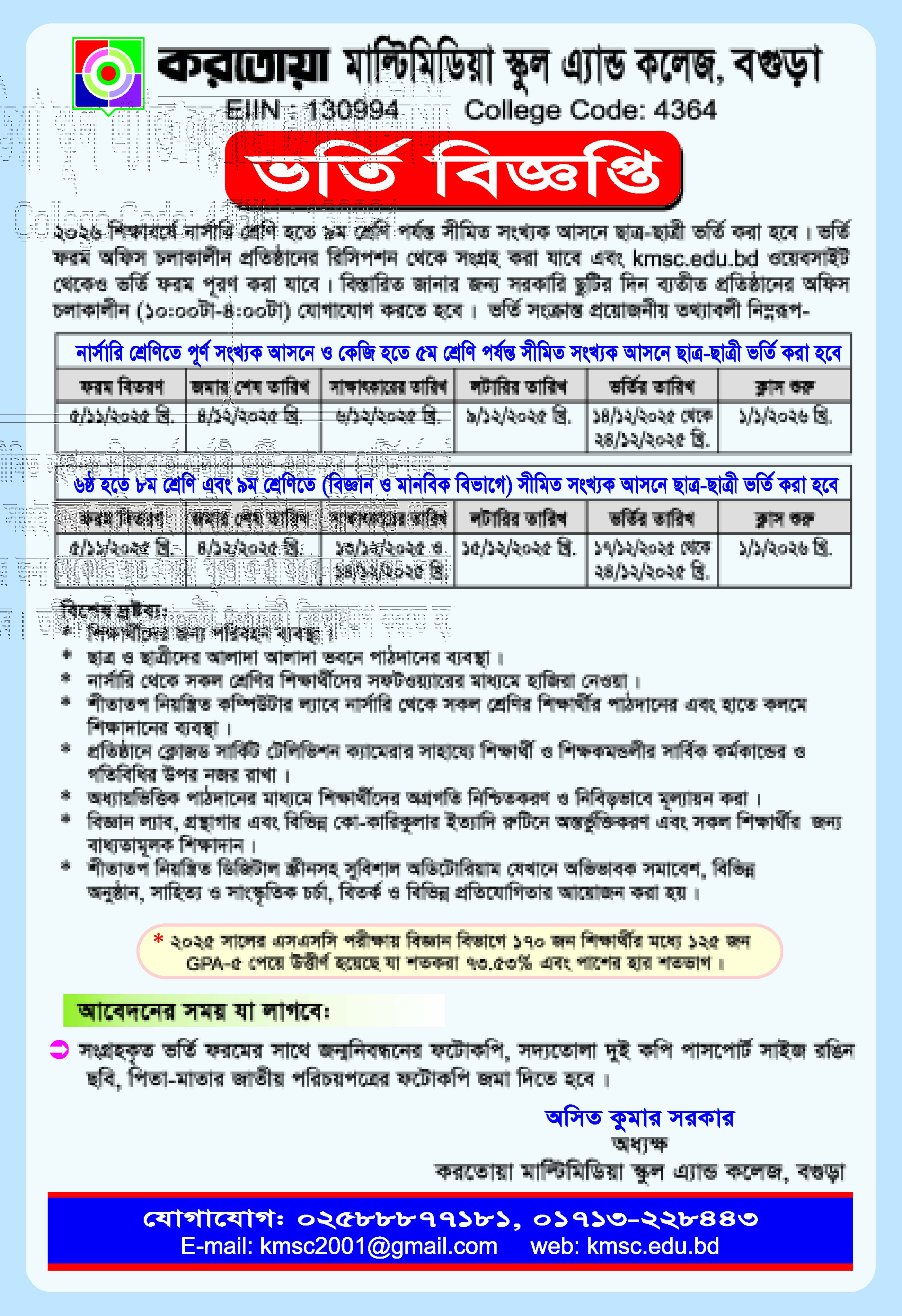 করতোয়া মাল্টিমিডিয়া স্কুল এ্যান্ড কলেজ, বগুড়ায় নার্সারি শ্রেণি হতে ৯ম শ্রেণি পর্যন্ত ভর্তি বিজ্ঞপ্তি