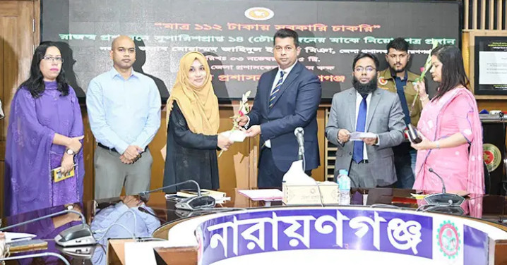 আজ সোমবার (৩ অক্টোবর) দুপুরে নারায়ণগঞ্জ জেলা প্রশাসক মোহাম্মদ জাহিদুল ইসলাম মিঞা সুপারিশপ্রাপ্তদের হাতে নিয়োগপত্র তুলে দেন।