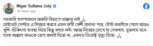 উন্নত চিকিৎসাব্যবস্থার অভাবে বাংলাদেশ ছেড়ে সিঙ্গাপুর, থাইল্যান্ডে গিয়ে চিকিৎসা করানোর ঘটনাও অহরহ দেখা যায়। কিন্তু বাংলাদেশের মতো উন্নয়নশীল দেশের ক’জন মানুষের বিদেশে গিয়ে সঠিক চিকিৎসার সুযোগ মেলে? তাদের কাছে দেশের চিকিৎসাব্যবস্থাই একমাত্র ভরসা। বাংলাদেশের অধিনায়ক কোনো এক হাসপাতালের চিকিৎসাব্যবস্থা দেখেই এমন পোস্ট দিয়েছেন। যদিও জানা যায়নি তিনি কোন হাসপাতালে ছিলেন।