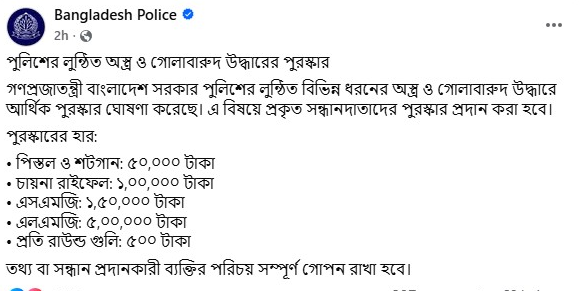 পুলিশ সদর দপ্তর জানায়, সরকার বাংলাদেশ পুলিশের লুণ্ঠিত বিভিন্ন ধরনের অস্ত্র ও গোলাবারুদ উদ্ধারে আর্থিক পুরস্কার ঘোষণা করেছে। লুণ্ঠিত অস্ত্র ও গোলাবারুদের প্রকৃত সন্ধানদাতাদের পুরস্কৃত করা হবে। পুরস্কারের পরিমাণ-এলএমজি ৫ লাখ টাকা, এসএমজি দেড় লাখ টাকা, চায়না রাইফেল এক লাখ টাকা এবং পিস্তল ও শটগান ৫০ হাজার টাকা। আর প্রতি রাউন্ড গুলির জন্য পুরস্কার ৫০০ টাকা।