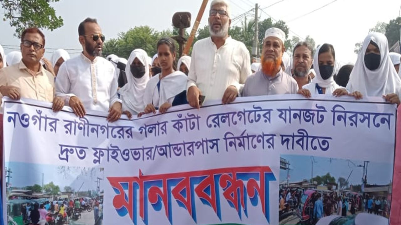 নওগাঁর রাণীনগর রেলগেটে যানজট নিরসনের দাবিতে মানববন্ধন