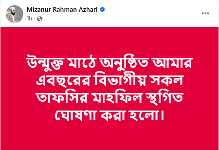 আজহারীর ভাষায়, নির্বাচনের ঠিক আগমুহূর্তে আমাকে ঘিরে এ ধরনের বড় তাফসির আয়োজন যুক্তিযুক্ত হবে না। তাই সার্বিক পরিস্থিতি বিবেচনায় আমি এ বছরের বিভাগীয় তাফসির মাহফিলগুলো স্থগিত রাখার সিদ্ধান্ত নিয়েছি। তিনি আরও জানান, নির্বাচন-পরবর্তী স্থিতিশীল পরিস্থিতিতে পুনরায় তাফসিরুল কোরআনের ঐতিহাসিক মাহফিলগুলো শুরু করা হবে, ইনশা আল্লাহ।