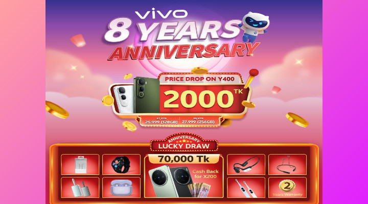 ভিভো এখন কেবল একটি ব্র্যান্ড নয়, এটি দেশের স্মার্টফোন ব্যবহারকারীদের কাছে নির্ভরতা ও পছন্দের প্রতীক। গ্রাহকদের ভালোবাসা এবং আট বছরের সাফল্য উদযাপনের অংশ হিসেবে ভিভো এনেছে বিশেষ উপহার ও অফার। প্রিয় গ্রাহকদের জন্য ঘোষণা করা হয়েছে ৮ম বার্ষিকী উদযাপন ক্যাম্পেইন। এই ক্যাম্পেইনে অংশ নেওয়া যাবে অফলাইনে। এই ক্যাম্পেইনের মাধ্যমে ভিভোর যেকোনো আউটলেট থেকে ভিভো ওয়াই২১ডি, ওয়াই২৯, ওয়াই৪০০, ভি ৬০, ভি৬০ লাইট এবং এক্স২০০ মডেলগুলো ক্রয় করলেই মিলবে লাকি ড্র-তে অংশ নেওয়ার সুযোগ। মেগা গিফট হিসেবে পাওয়া যাবে এক্স২০০ এ ৭০,০০০ টাকা ক্যাশব্যাকের সুযোগ। তবে, অফারটি উপভোগ করা যাবে ক্রয়ের ৭ দিনের মধ্যে এবং এটি শুধুমাত্র এককালীন নগদ পেমেন্টের ক্ষেত্রে প্রযোজ্য (ইএমাই প্রযোজ্য নয়) ।