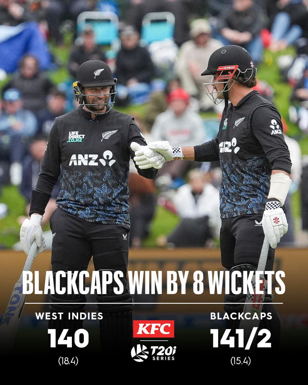 টসে হেরে ব্যাটিংয়ে নেমে ওয়েস্ট ইন্ডিজ ১৮.৪ ওভারে ১৪০ রানেই গুটিয়ে যায়। তাড়া করতে নেমে ২৬ বল ও ৮ উইকেটে হাতে রেখেই ১৪১ রানের লক্ষ্যে পৌছে যায় মিচেল স্যান্টনারের দল। ৩-১ ব্যবধানে নিশ্চিত করে সিরিজও।