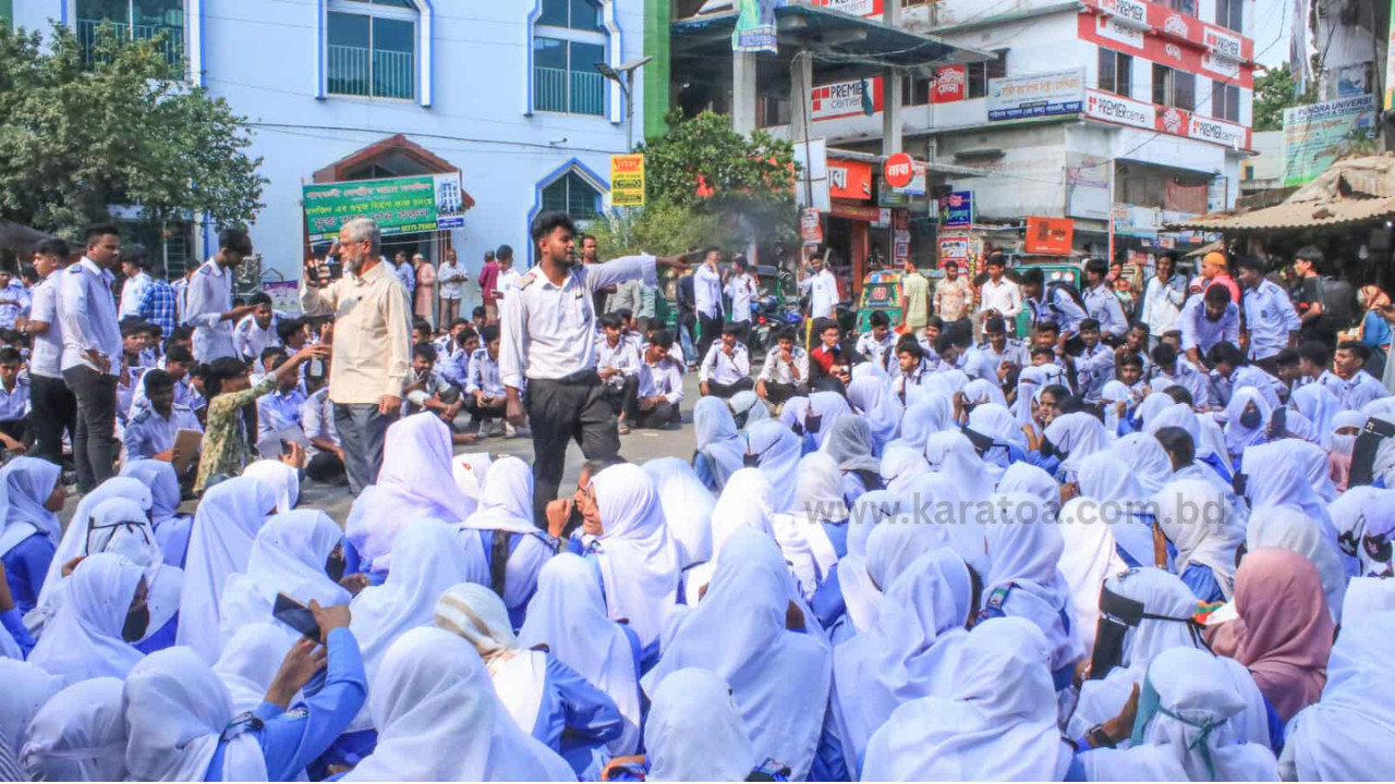 গাবতলীতে এইচএসসি পরীক্ষা কেন্দ্র স্থানান্তরের দাবিতে শিক্ষার্থীদের সড়ক অবরোধ, ছবি: দৈনিক করতোয়া ।