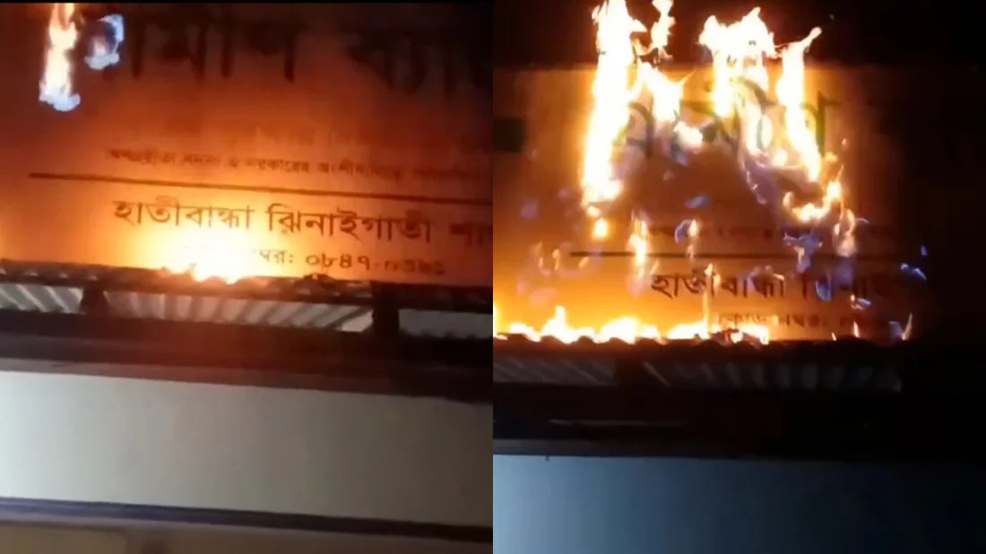 শেরপুরের ঝিনাইগাতীতে গ্রামীণ ব্যাংকের হাতিবান্ধা শাখা অফিসের গেটের সামনে আগুন দিয়েছে দুর্বৃত্তরা। বুধবার (১৯ নভেম্বর) ভোররাতে এ ঘটনা ঘটে। রাত ৮টার দিকে নিষিদ্ধ ঘোষিত সংগঠন ছাত্রলীগের শেরপুর জেলা শাখার সাধারণ সম্পাদক রেজাউল করিম রেজা তার ফেসবুকে আগুন দেওয়ার একটি ভিডিও প্রকাশ করেন।