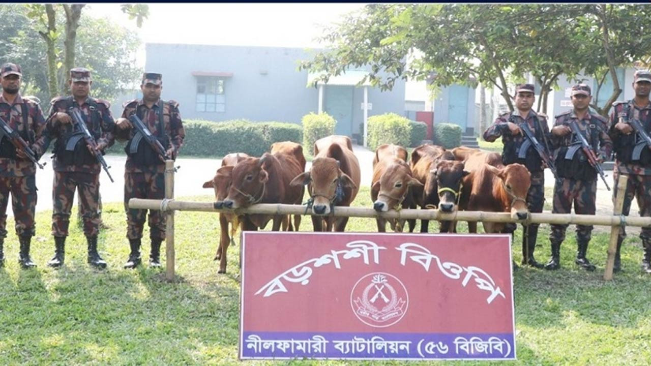 বিজিবি সূত্রে জানা যায়, আজ রোববার (২৩ নভেম্বর) ভোরে বোদা উপজেলার বড়শশী ইউনিয়নের বগদুলঝুলা সীমান্ত এলাকায় গোপন সংবাদের ভিত্তিতে নীলফামারী ব্যাটালিয়নের (৫৬ বিজিবি) বড়শশী বিওপির একটি যৌথ বিশেষ টহল দল অভিযান পরিচালনা করেন। অভিযানে ভারত থেকে অবৈধ পথে নিয়ে আসা মোট ছয়টি মালিক বিহীন গরু আটক করা হয়। আটককৃত গরুগুলোর আনুমানিক মূল্য প্রায় ৪ লাখ ৫০ হাজার।