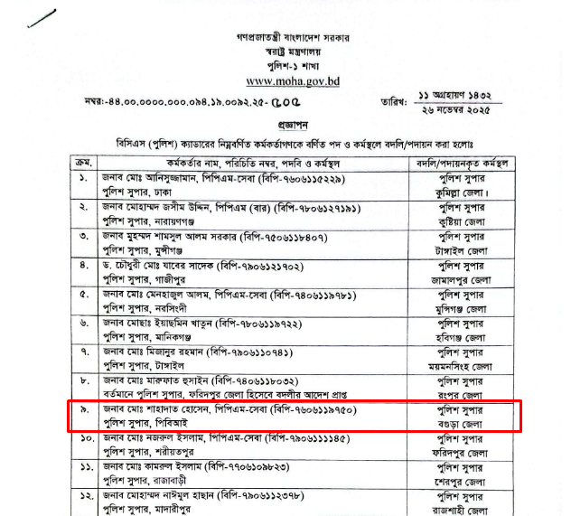বগুড়ার নতুন পুলিশ সুপার হলেন শাহাদাত হোসেন