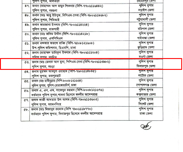 দেশের ৬৪ জেলায় নতুন পুলিশ সুপার পদায়ন করেছে সরকার। আজ বুধবার (২৬ নভেম্বর) স্বরাষ্ট্র মন্ত্রণালয়ের পুলিশ-১ শাখা থেকে এ বিষয়ে প্রজ্ঞাপন জারি করা হয়। এই প্রজ্ঞাপনে বগুড়ার পুলিশ সুপার হিসেবে যোগদান করছেন মো. শাহাদাত হোসেন। তিনি এর আগে পিবিআই’র পুলিশ সুপার হিসেবে কর্মরত ছিলেন। অপরদিকে বগুড়ার সদ্যবিদায়ী পুলিশ সুপার জিদান আল মুসাকে দিনাজপুরের পুলিশ সুপারের দায়িত্ব দেওয়া হয়েছে।