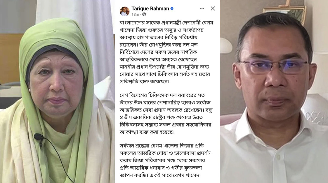 বিএনপির ভারপ্রাপ্ত চেয়ারপারসন তারেক রহমান এক ফেসবুক স্ট্যাটাসে জানিয়েছেন, বাংলাদেশের সাবেক প্রধানমন্ত্রী দেশনেত্রী বেগম খালেদা জিয়া গুরুতর অসুস্থ ও সংকটাপন্ন অবস্থায় হাসপাতালের নিবিড় পরিচর্যায় রয়েছেন। তাঁর রোগমুক্তির জন্য দল মত নির্বিশেষে দেশের সকল স্তরের নাগরিক আন্তরিকভাবে দোয়া অব্যাহত রেখেছেন। মাননীয় প্রধান উপদেষ্টা তাঁর রোগমুক্তির জন্য দোয়ার সাথে সাথে চিকিৎসার সর্বত্র সহায়তার প্রতিশ্রুতি ব্যক্ত করেছেন।
