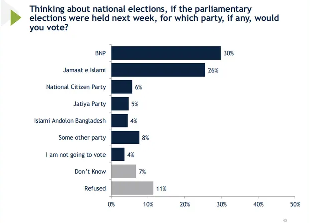 জরিপ অনুসারে, একই শর্তে, অর্থাৎ আগামী সপ্তাহে জাতীয় নির্বাচন অনুষ্ঠিত হলে জাতীয় নাগরিক পার্টিকে (এনসিপি) ভোট দেবেন ৬ শতাংশ ভোটার। জাতীয় পার্টিকে ভোট দেবেন ৫ শতাংশ ভোটার এবং ইসলামী আন্দোলন বাংলাদেশকে ভোট দেবেন ৪ শতাংশ ভোটার। এবং অন্যান্য দলকে ভোট দেবেন ৮ শতাংশ ভোটার।