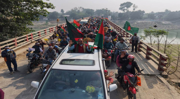 নওগাঁ-২ আসনে বিএনপি প্রার্থী সামসুজ্জোহা খানের মোটরসাইকেল শোডাউন