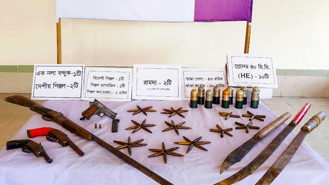 অভিযানে বিদেশি পিস্তল ১টি, দেশি পিস্তল ২টি, একনলা বন্দুক ১টি, ৪০ মি.মি. এইচই এমজি-৩ গ্রেনেড ৭টি, ৪০ মি.মি. এইচই এমজি-৪ গ্রেনেড ৩টি, ৪৩ রাউন্ড গুলি, পিস্তলের ম্যাগাজিন, পিস্তল বল ২ রাউন্ড, ফাঁকা কার্তুজ ২০ রাউন্ড এবং তিনটি দেশি ধারালো অস্ত্র উদ্ধার করা হয়। আইনি প্রক্রিয়ায় এসব অস্ত্র টেকনাফ থানায় হস্তান্তর করা হয়েছে।