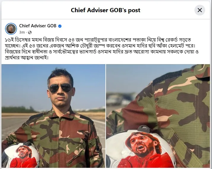 ১৬ই ডিসেম্বর মহান বিজয় দিবসে ৫৪ জন প্যারাট্রুপার বাংলাদেশের পতাকা নিয়ে প্যারাট্রুপিং করে বিশ্ব রেকর্ড গড়তে যাচ্ছেন।এই ৫৪ জনের একজন আশিক চৌধুরী জাম্প করবেন ওসমান হাদির ছবি আঁকা হেলমেট পরে।