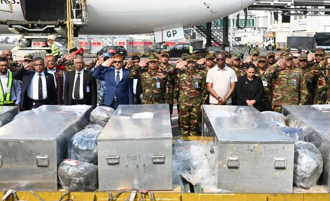 আইএসপিআর জানায়, গত ১৩ ডিসেম্বর সুদানের আবেই এলাকায় জাতিসংঘ শান্তিরক্ষা মিশনের একটি ঘাঁটিতে সংঘটিত বর্বরোচিত সন্ত্রাসী ড্রোন হামলার ঘটনায় শাহাদাৎ বরণকারী ৬ জন শান্তিরক্ষীর মরদেহ শনিবার হযরত শাহজালাল আন্তর্জাতিক বিমানবন্দরে এমিরেটস এয়ারলাইন্সের একটি বিমানে দেশে প্রত্যাবর্তন করে।