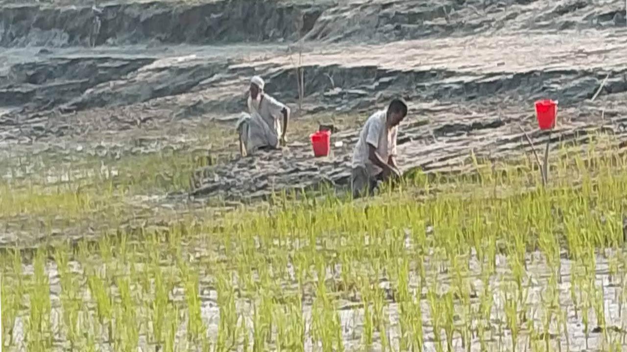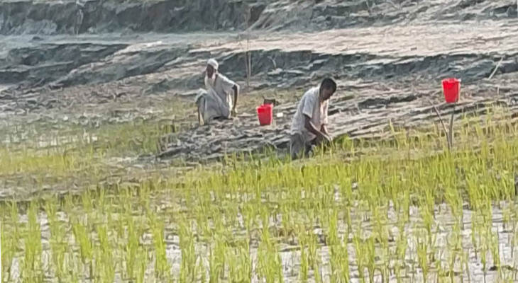 সিরাজগঞ্জের কাজিপুরে যমুনার জেগে ওঠা চরে বিনাচাষে কালিবোরো ধান রোপণ