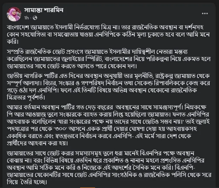 পোস্টে সামান্তা লিখেছেন, বাংলাদেশ জামায়াতে ইসলামী নির্ভরযোগ্য মিত্র না। তার রাজনৈতিক অবস্থান বা দর্শনসহ কোনো সহযোগিতা বা সমঝোতায় যাওয়া এনসিপিকে কঠিন মূল্য চুকাতে হবে বলে আমি মনে করি।তিনি বলেন, সম্প্রতি রাজনৈতিক জোট প্রসঙ্গে জামায়াতে ইসলামীর দায়িত্বশীল নেতারা মন্তব্য করেছিলেন—জামায়াতের জুলাইয়ের স্পিরিট, বাংলাদেশের নিয়ে পরিকল্পনা নিয়ে একমত হলে জামায়াতের সাথে জোট করতে আসতে পারে যেকোনো দল।
