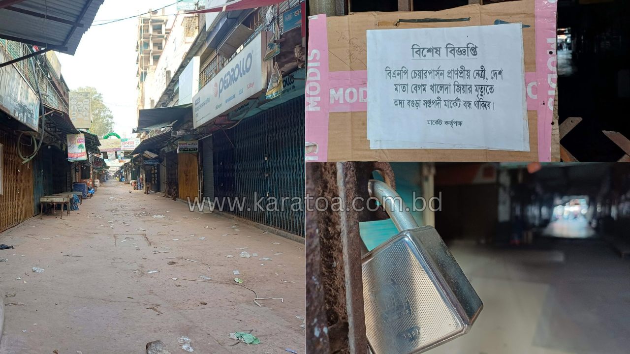 স্টাফ রিপোর্টার : সাবেক তিনবারের সফল প্রধানমন্ত্রী ও বিএনপি চেয়ারপারসন বেগম খালেদা জিয়ার মৃত্যুতে আজ বুধবার গভীর শোকাচ্ছন্ন জেলা বগুড়া। শহীদ রাষ্ট্রপতি জিয়াউর রহমানের স্ত্রী বগুড়ার পুত্রবধূ সবার প্রিয় এই নেত্রীর প্রতি শ্রদ্ধা জানাতে ও রাষ্ট্রীয় শোকের প্রতি সংহতি প্রকাশ করে সকাল থেকেই জেলা শহরের ছোট-বড় সব ধরনের দোকানপাট, ব্যবসাপ্রতিষ্ঠান ও বিপণীবিতান থেকে শুরু করে যাবতীয় ব্যবসায়িক কার্যক্রম বন্ধ রেখেছেন বগুড়ার আপমর মানুষ। শহরজুড়েই এক বিষন্নতার পরিবেশ। বগুড়ার সাথে সাথে স্থবির এই এই জনপদ কার্যক্রম।