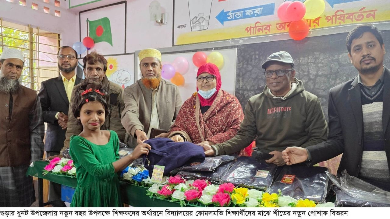 বগুড়ার ধুনটে শিক্ষকদের উপহারের শীতের পোশাক পেয়ে খুশি শিক্ষার্থীরা