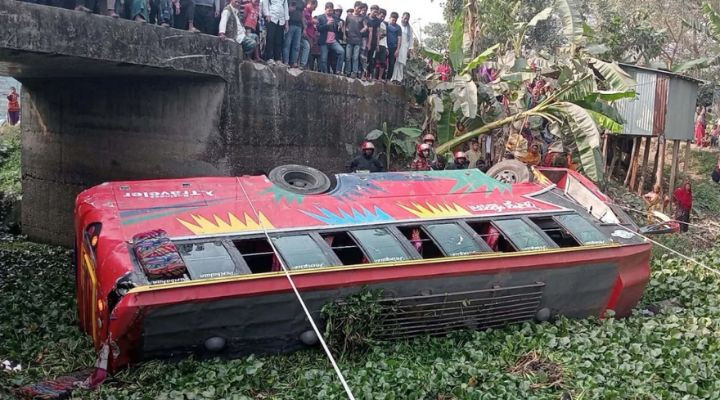 চাঁদপুরে ট্রাককে ওভারটেক করতে গিয়ে খালে পড়লো বাস, আহত ১৭