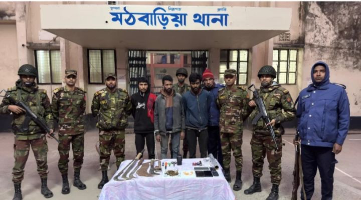 আজ বুধবার (২৮ জানুয়ারি) ভোর ৫টার দিকে মেজর মোস্তফা কামাল এর নেতৃত্বে মঠবাড়িয়ার তুষখালী এলাকায় অভিযান চালিয়ে আটক করা হয়। এ সময় তাদের কাছে থাকা দেশীয় অস্ত্র ও মাদক উদ্ধার করে।