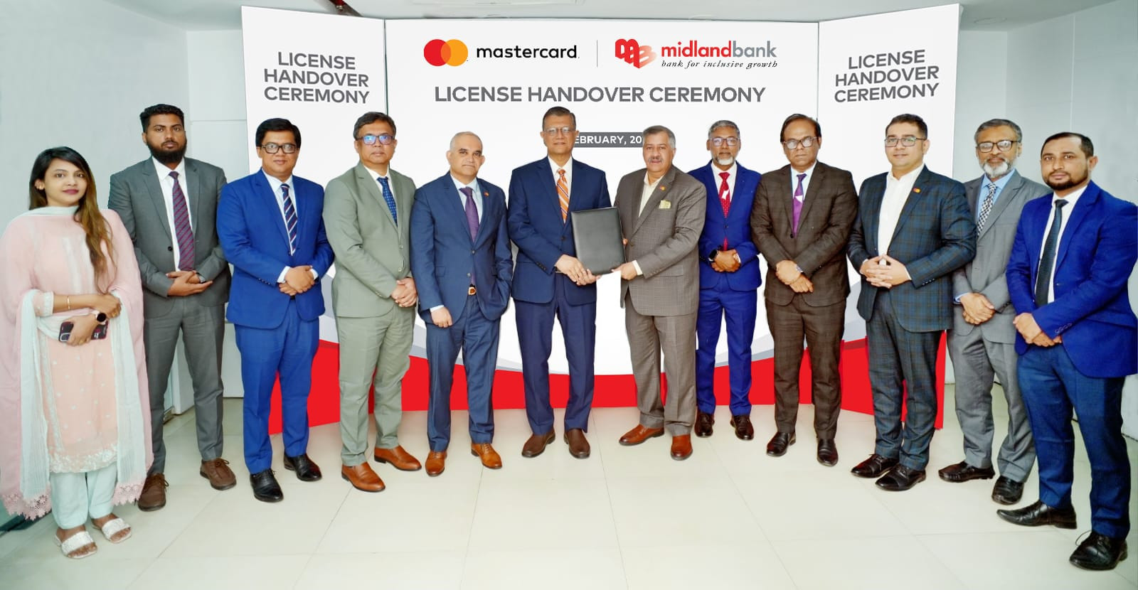 মিডল্যান্ড ব্যাংক পিএলসি-এর ব্যবস্থাপনা পরিচালক ও প্রধান নির্বাহী কর্মকর্তা মো. আহসান-উজ-জামান, আজ ১লা ফেব্রুয়ারী ২০২৬ তারিখে ঢাকায় ব্যাংকের প্রধান কার্যালয়ে আয়োজিত এক অনুষ্ঠানে মাস্টারকার্ড বাংলাদেশের কান্ট্রি ম্যানেজার সৈয়দ মোহাম্মদ কামালের কাছ থেকে মাস্টারকার্ড অনুমোদিত সদস্যপদ লাইসেন্স গ্রহণ করেন।