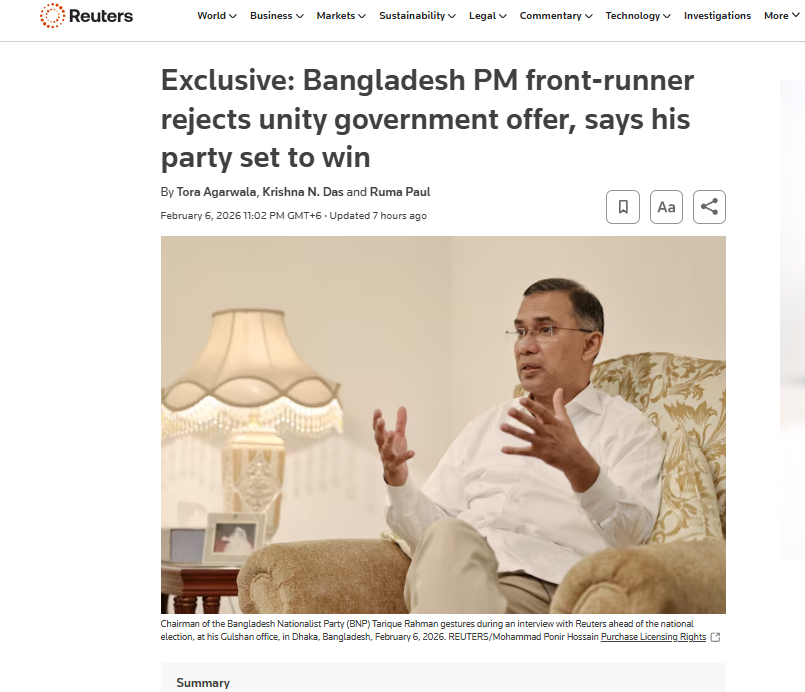রয়টার্সকে তারেক রহমান: জামায়াতের সঙ্গে ঐক্য সরকার করবে না বিএনপি
