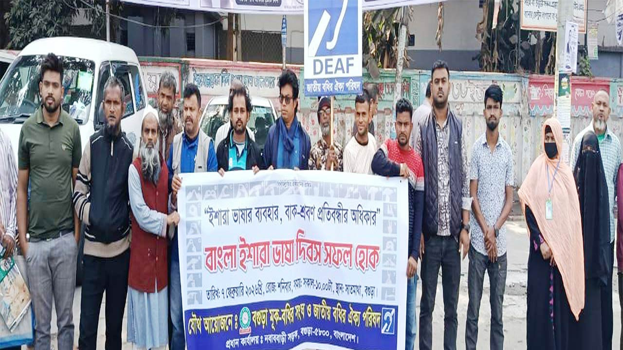 ‘ইশারা ভাষার ব্যবহার, বাক-শ্রবণ প্রতিবন্ধী ব্যক্তির অধিকার’-এই প্রতিপাদ্য নিয়ে আজ শনিবার (৭ ফেব্রুয়ারি) বগুড়াসহ উত্তরাঞ্চলের বিভিন্ন জায়গায় বাংলা ইশারা ভাষা দিবস পালিত হয়েছে। বগুড়া মূক-বধির সংঘ:  দিবসটি পালন উপলক্ষ্যে আজ শনিবার (৭ ফেব্রুয়ারি) সকাল ১০টায় বগুড়া মূক-বধির সংঘের উদ্যোগে একটি র‌্যালি শহরের প্রধান কার্যালয় সড়ক প্রশিক্ষণ করে সাতমাথায় এক মানববন্ধন কর্মসূচি পালন করা হয়।