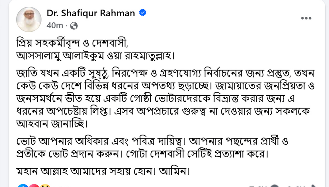জামায়াতের জনপ্রিয়তা ও জনসমর্থনে ভীত হয়ে একটি গোষ্ঠী ভোটারদের বিভ্রান্ত করার জন্য এ ধরনের অপচেষ্টায় লিপ্ত বলে দাবি করেছেন বাংলাদেশ জামায়াতে ইসলামীর আমির ডা. শফিকুর রহমান। অপপ্রচারে গুরুত্ব না দিয়ে পছন্দের প্রার্থী ও প্রতীকে ভোট দিতে আহ্বান জানিয়েছেন তিনি।বুধবার (১১ ফেব্রুয়ারি) দুপুরে নিজের ভেরিফাইড ফেসবুক পেইজে দেওয়া এক স্ট্যাটাসে এ আহ্বান জানান তিনি।