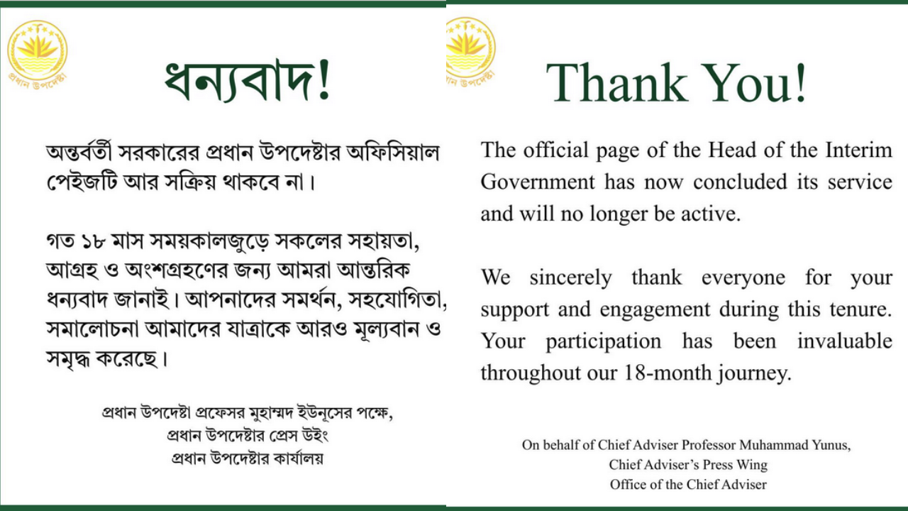প্রধান উপদেষ্টার ফেইসবুক পেইজের কার্যক্রম বন্ধ ঘোষণা