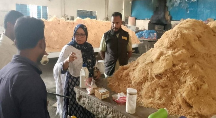 আরও পড়ুনভ্রাম্যমাণ আদালতে পণ্যের মোড়ক ব্যবহার না করা, খাদ্যে নিষিদ্ধ দ্রব্য মিশ্রণ এবং অবৈধ প্রক্রিয়ায় পণ্য উৎপাদনের অপরাধে মৌবন বেকারীকে ৮০ হাজার টাকা এবং অবৈধ প্রক্রিয়ায় পণ্য উৎপাদনের অপরাধে মধুমতী মিষ্টি ভান্ডারকে ১০ হাজার টাকাসহ ৯০ হাজার টাকা জরিমানা করা হয়। অবৈধ মজুতদারী, অতিরিক্ত দামে পণ্য বিক্রয় এবং খাদ্যে ভেজালের মত অপরাধের বিরুদ্ধে জিরো টলারেন্স নীতি বাস্তবায়নে র্যাব-১৩’র গোয়েন্দা তৎপরতা এবং চলমান অভিযান অব্যাহত থাকবে।