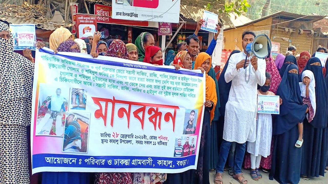 বগুড়া কাহালুর ঢাকন্তা গ্রামের প্রতিপক্ষের হামলায় আহত, ভুক্তভোগীর পরিবারের মানববন্ধন
