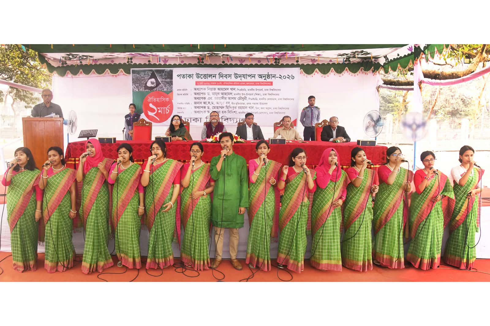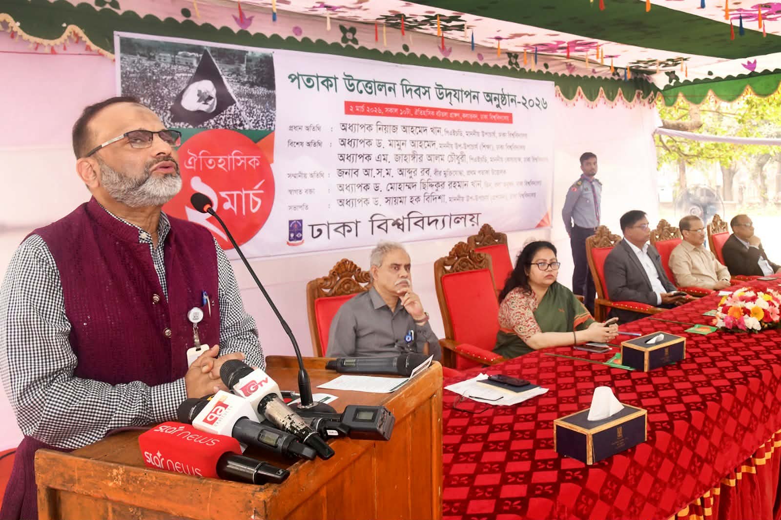 আজ সোমবার (২ মার্চ) বিশ্ববিদ্যালয়ের কলাভবন সংলগ্ন বটতলা প্রাঙ্গণে আয়োজিত ঐতিহাসিক ‘পতাকা উত্তোলন দিবস’ উদযাপন অনুষ্ঠানে প্রধান অতিথির বক্তব্যে তিনি এ কথা বলেন। অনুষ্ঠানের শুরুতে উপাচার্য জাতীয় পতাকা উত্তোলনের মাধ্যমে দিবসের কর্মসূচির উদ্বোধন করেন। বিশ্ববিদ্যালয়ের প্রো-ভাইস চ্যান্সেলর (প্রশাসন) অধ্যাপক ড. সায়মা হক বিদিশার সভাপতিত্বে আয়োজিত অনুষ্ঠানে প্রো-ভাইস চ্যান্সেলর (শিক্ষা) অধ্যাপক ড. মামুন আহমেদ এবং কোষাধ্যক্ষ অধ্যাপক ড. এম. জাহাঙ্গীর আলম চৌধুরী বিশেষ অতিথি হিসেবে বক্তব্য রাখেন। কলা অনুষদের ডিন অধ্যাপক ড. মোহাম্মদ ছিদ্দিকুর রহমান খান স্বাগত বক্তব্য দেন এবং অনুষ্ঠান সঞ্চালনা করেন ভারপ্রাপ্ত রেজিস্ট্রার মুনসী শামস উদ্দিন আহম্মদ।