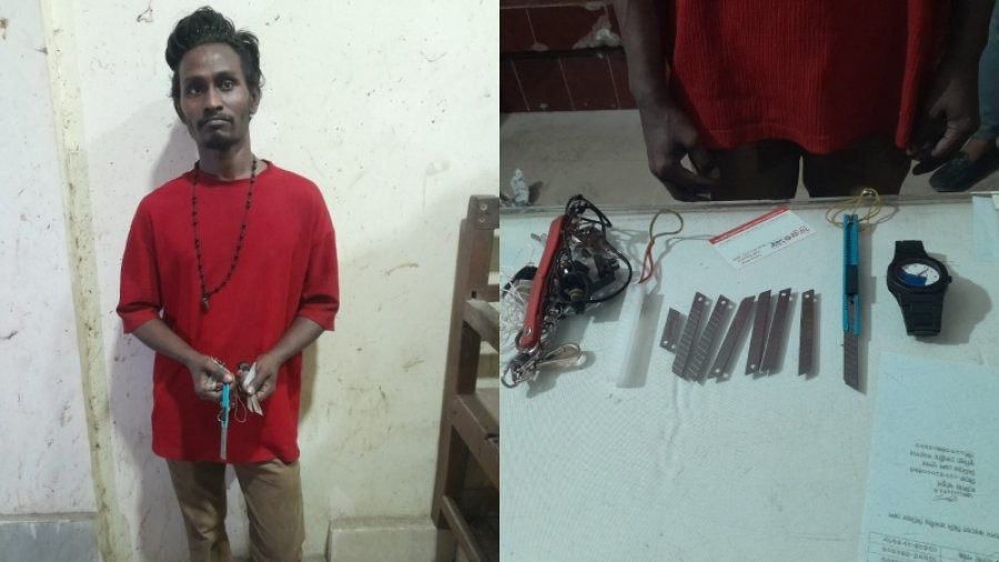 এসময় তার কাছ থেকে একটি কাটার, ছয়টি ব্লেড, একটি ঘড়ি, দুটি চাবির রিং ও ১ গজ পরিমাণ সুতা উদ্ধার করা হয়।