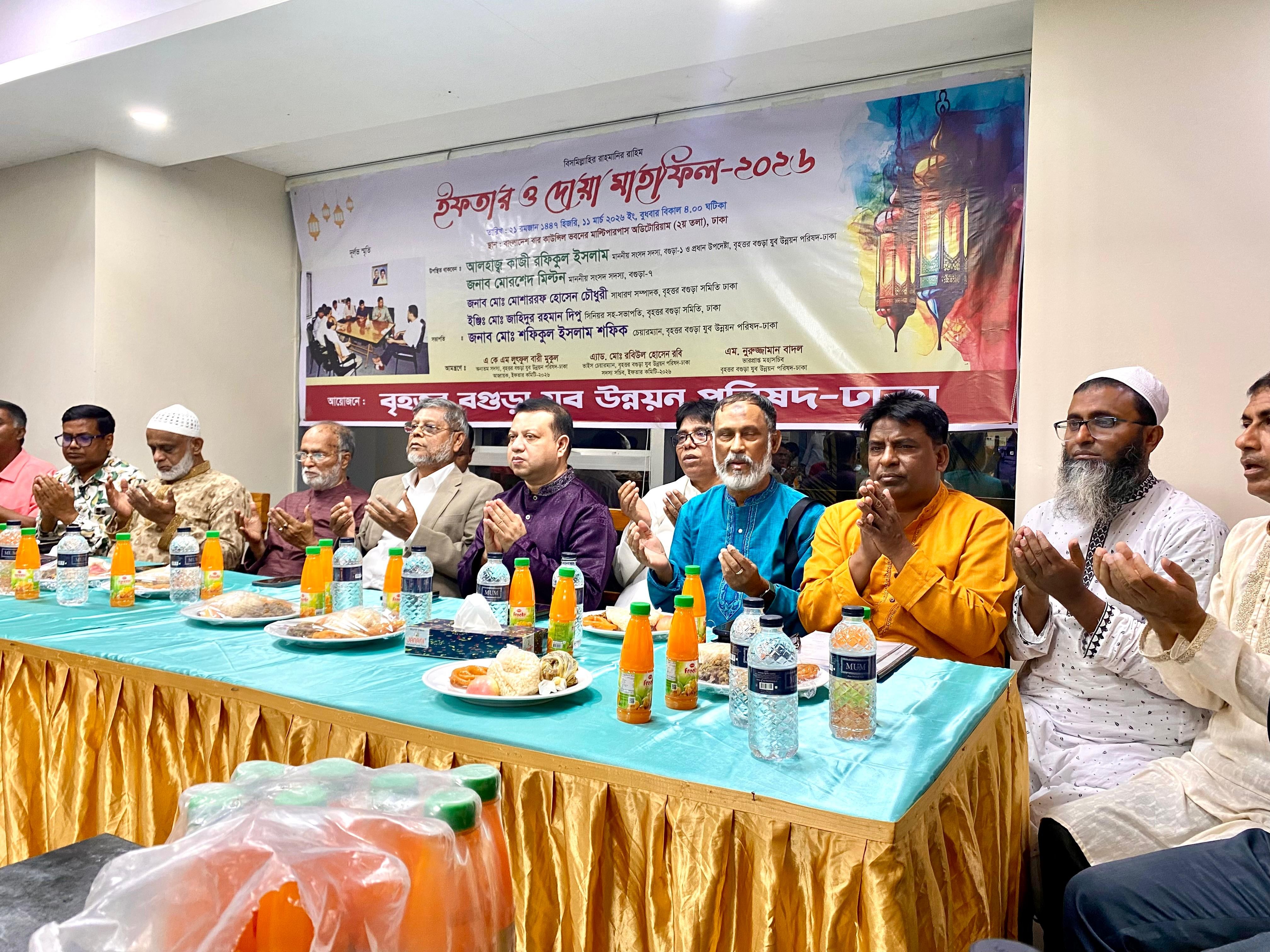 বৃহত্তর বগুড়া যুব উন্নয়ন পরিষদ, ঢাকা এর উদ্যোগে অদ্য ১১ মার্চ ২০২৬ বুধবার বাংলাদেশ কাউন্সিল ক্যাফেটোরিয়ায় দোয়া ও ইফতার মাহফিল অনুষ্ঠিত হয়। অনুষ্ঠানে অতিথি হিসেবে  উপস্থিত ছিলেন বগুড়া- ১ আসনের সংসদ সদস্য আলহাজ্ব কাজী রফিকুল ইসলাম, দৈনিক করতোয়ার সম্পাদক লায়ন মোজাম্মেল হক লালু, ডিএমপির ডিসি (ক্রাইম) তারেক জুবায়ের, বৃহত্তর বগুড়া সমিতি, ঢাকা'র সহ-সভাপতি ডা: আতাউর রহমান লিটন, সহ-সভাপতি এ কে এম লুৎফুল বারী মুকুল, সংগঠনের কো- চেয়ারম্যান মোঃ নুরুল আলম বাদল এবং সংগঠনের ভারপ্রাপ্ত মহাসচিব এম. নুরুজ্জামান বাদল।