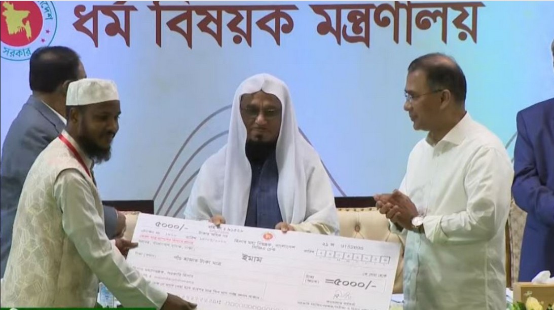ইমাম ও মুয়াজ্জিন, খাদেম, পুরোহিত, সেবায়েত, বিহার অধ্যক্ষদের সম্মানি প্রদান কার্যক্রমের উদ্বোধন করেছেন প্রধানমন্ত্রী তারেক রহমান। শনিবার (১৪ মার্চ) সকালে রাজধানীর ওসমানী স্মৃতি মিলনায়তনে তিনি এ কার্যক্রমের উদ্বোধন করেন। বৃহস্পতিবার (১৩ মার্চ) তথ্য ও সম্প্রচার মন্ত্রণালয়ের এক বার্তায় বলা হয়, ৪ হাজার ৯০৮টি মসজিদের ইমাম, মুয়াজ্জিন ও খাদেমদের পাশাপাশি একই সঙ্গে ৯৯০টি মন্দিরের পুরোহিত, ১৪৪টি বৌদ্ধবিহারের অধ্যক্ষ এবং ৩৯৬টি গির্জার যাজকসহ উপাসনালয়ের সংশ্লিষ্ট দায়িত্বপ্রাপ্ত ব্যক্তিকে সম্মানি প্রদান করা হবে।