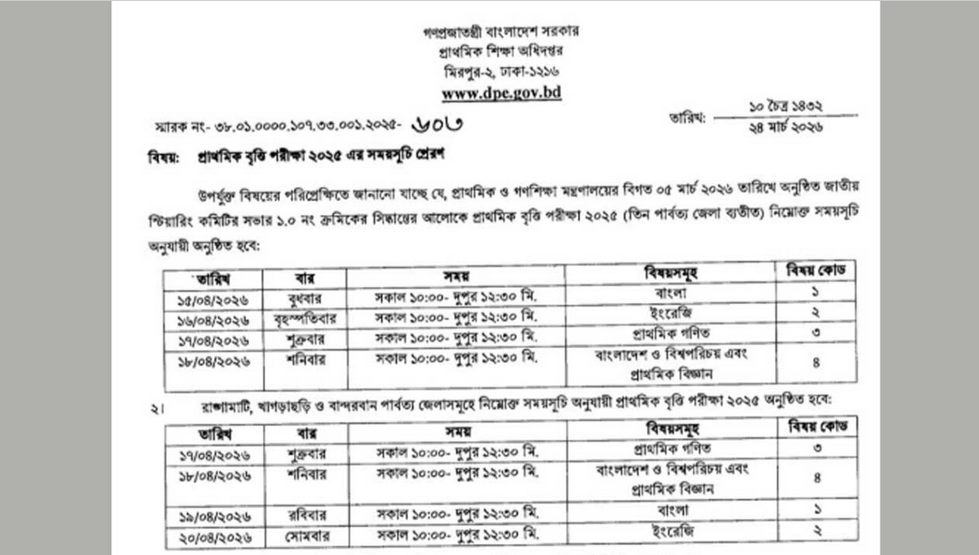২০২৫ সালের প্রাথমিক বৃত্তি পরীক্ষার সময়সূচি প্রকাশ করেছে প্রাথমিক শিক্ষা অধিদপ্তর। আগামী ১৫ এপ্রিল থেকে সারাদেশে একযোগে এই পরীক্ষা শুরু হবে। গত ৫ মার্চ প্রাথমিক ও গণশিক্ষা মন্ত্রণালয়ের জাতীয় স্টিয়ারিং কমিটির সভায় গৃহীত সিদ্ধান্ত অনুযায়ী এই সূচি প্রকাশ করা হয়।বুধবার (২৫ মার্চ) অধিদপ্তরের নির্দেশনায় জানানো হয়েছে, দেশের তিন পার্বত্য জেলা (রাঙামাটি, খাগড়াছড়ি ও বান্দরবান) ব্যতীত অন্যান্য সব জেলায় পরীক্ষা শুরু হবে ১৫ এপ্রিল। প্রথম দিন বুধবার সকাল ১০টা থেকে দুপুর ১২টা ৩০ মিনিট পর্যন্ত বাংলা বিষয়ের পরীক্ষা অনুষ্ঠিত হবে।