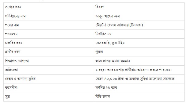 শীর্ষস্থানীয় শিল্পপ্রতিষ্ঠান আবুল খায়ের গ্রুপ ‘টেরিটরি সেলস অফিসার (টিএসও)’ পদে জনবল নিয়োগের বিজ্ঞপ্তি প্রকাশ করেছে। এরই মধ্যে আবেদন শুরু হয়েছে, চলবে ১০ এপ্রিল পর্যন্ত। আগ্রহী প্রার্থীরা নির্ধারিত সময়সীমার মধ্যে আবেদন করতে পারবেন। তবে প্রার্থীকে অবশ্যই স্নাতকোত্তর অথবা সমমান ডিগ্রিধারী হতে হবে।